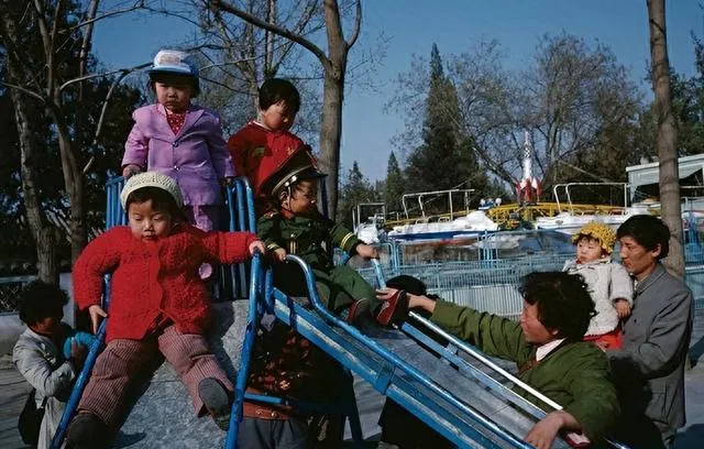 这张里孩子们穿得花里胡哨,滑梯顶上一个个排着队,帽子歪着,羊角辫翘着,公园滑梯那会儿可是稀罕东西,逢到星期天家里大人和孩子都盼着这点乐子,排队总得埋怨两句:快点呀,别磨叽,轮到自己冲下来,屁股咣当一着地,衣服不知道磨破几个洞,但满脸都开心,旁边还有穿警帽的小哥,一板一眼地喊注意安全,妈妈们在下面准备接着,不敢走神,那时觉得哪有比玩滑梯更新奇的事了,现在小孩看到手机还能坐住,咱那时候就是公园滑梯排队也斗嘴。