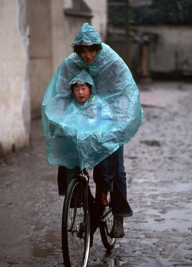 雨天出门,全家上下只有一套蓝色雨披,母子俩都钻雨衣里,遮风挡雨,前座小孩头发贴着额头,妈妈嘴里还念叨着快点、别迟到,上下学自行车道全是这样的身影,现在大城市洋伞小轿车,看不到这景儿了,八十年代的雨天,总有蓝蓬蓬的雨衣在路上飘,脚下水花,头上母爱。
