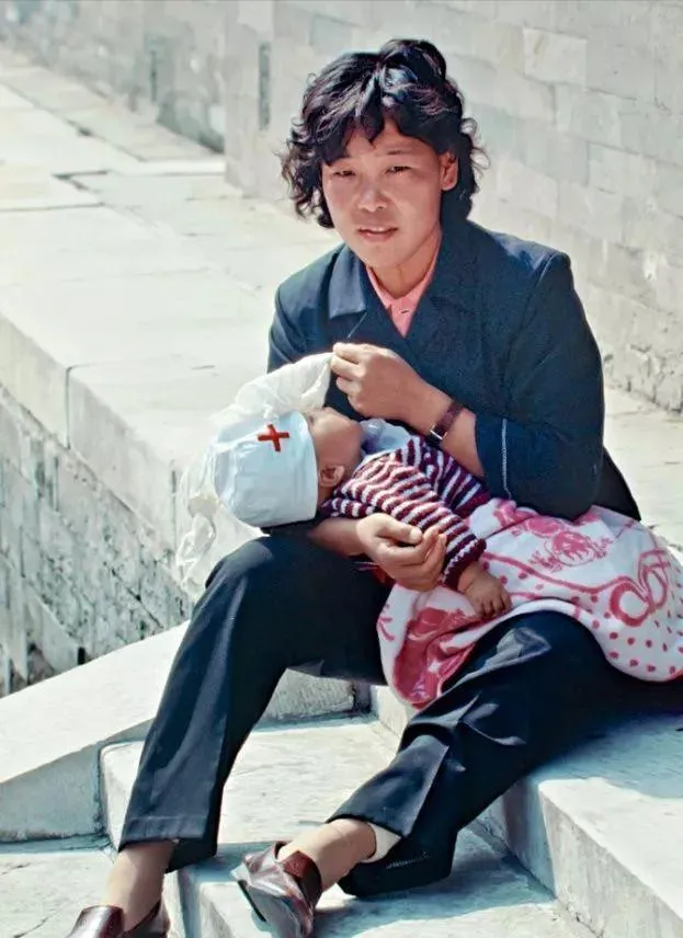 石阶旁边,年轻妈妈怀里抱着孩子,嘴边挂着笑,有点疲惫但更温柔,娃娃头顶还有红十字的帽,估计是刚从医院回来的样子,家里人总说,那时候养孩子不娇气,病了也不怕,妈妈手底下一拍背,抱在怀里就觉得踏实,现在小区里出门带娃推车装备一整套,八十年代就一条毛毯加怀抱,也能把孩子笑呵呵养大。