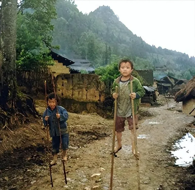图上一对小孩踩着竹子做的高跷,脚下泥巴路粘着,裤腿脏兮兮的,玩的时候根本顾不上这些,高跷就是两根结实的竹竿,细中带直,脚底用刀掏了个脚窝,再用绳子绕两圈固定,手上一把攥紧,胆大的当然往前抢,胆小的就在原地比划,村口玩这个总少不了摔跤,摔了也不哭,爬起来拍拍屁股,邻居大婶嚷嚷说再摔小心回家你妈不打你,我小时候踩不稳,结果一屁股坐水沟里,回家还得瞒着不敢让大人看裤子,那会儿哪有手机电视,几根竹竿就闹腾得小山村热闹了好几天