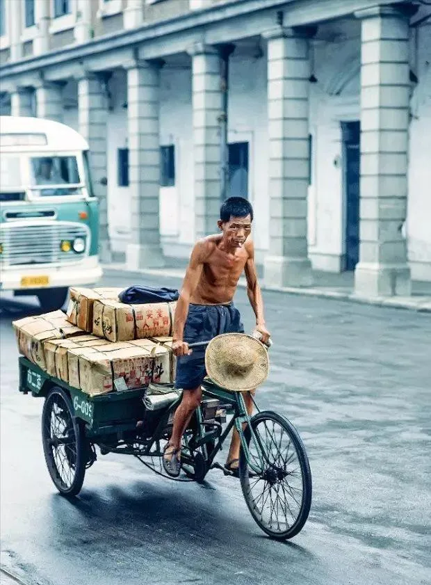 画里这个三轮车可不是谁都推得动的,铁架车身子宽,后头一大堆纸箱,小伙子赤膊上阵,正阳光下连脸都是汗,车上随手丢着一个草帽,骑在城里大街跑,车重得发哑,拐弯都得慢慢盘,冬天风硬,夏天太阳辣,谁见了都知道,这活力气比谁都大,家里人有时会专门把家里不用的麻袋让他帮忙带去菜场,爸说三轮车是家里能挣钱养家的宝贝,这李子胡同、鸡蛋巷子,三轮车摇摇晃晃走出全城人最平常也最真实的日子。