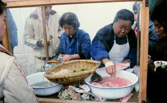 老北京粉皮摊,玻璃窗里一白一粉两大盆,手脚快的大姐一勺递一份,篮子里绿菜掺着粉皮,顾客忙着递零钱,旁边有个篮子专装纸币票证,吃的时候谁都不急,一口热汤一口咸菜,每次看见队伍长,妈妈就说快去抢个位,慢了今天又吃不上,八十年代的街头,粉皮荷包蛋就是一天的幸福起点。