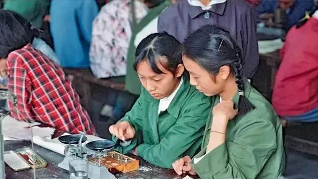 理科教室现场,天平和砝码码得齐齐整整,姑娘小伙围一堆琢磨称量,白绿校服,扎着麻花辫,大家表情格外专注,这种动手实验,有时老师远远站着不说话,看你们自己琢磨,不像现在网上查数据直接交卷,八十年代学理化,得真刀真枪掂一掂分量,学习的认真样子就是照片最打眼的地方。