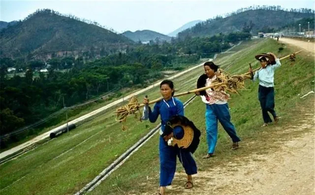 图中三位妇女肩膀挑着木扁担,扁担头挂着水桶,走在长长的堤坝上,这是那会儿深圳妇女的寻常一天,挑水、洗衣、种地样样行,身上穿的还是蓝色棉布褂,走起路来扁担吱呀作响,妈妈说,以前用水靠人工挑,家家户户门口自备水缸,太阳底下排队打水,有时还得排半天,哪像现在拧开水龙头哗哗流。