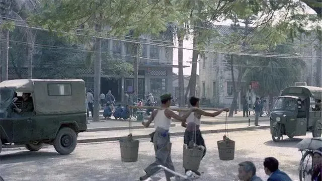 图中两个男人赤膊上阵,扁担抬在肩上,铁皮桶安安稳稳吊着,挑水走街,是八十年代寻常不过的体力活,家里小孩子暑假还跟着跑一趟学着强壮身体,遇上太阳毒,不一会背上衣服就湿一片,谁要是手稳水不撒,街坊都乐呵说这小伙子有出息。