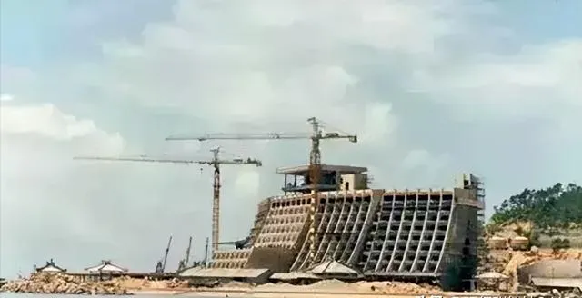 这栋像贝壳一样的建筑是正在动工的南海酒店,八十年代深圳第一家五星级的头牌,那时候起桩打地基,全靠工人师傅挥汗如雨,一个个塔吊杵在海岸线上,楼梯间全是钢筋架子,哥哥说,那时全国人都觉得深圳有本事,能修出这种大酒店,见识就不一样,可那会高楼真不多,海风一吹工地就蒙上一层沙子。
