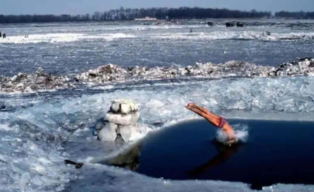 ▲1981年,佳木斯松花江,一位冬泳者跳入冰窟