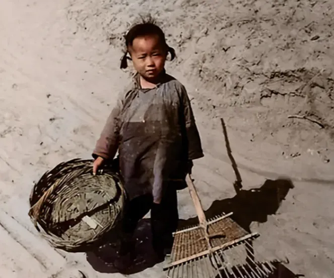 这个扎着小辫的小姑娘,手里一头提竹筐一头握竹耙,旧衣上补丁一层压一层,竹筐边沿磨得起刺,耙齿间还挂着草梗,脚下土路干得发白,风一吹就起灰,她的眼神有点怯又有点倔,像是在打量镜头,也像在心里催自己快点回家,小时候在乡下见过类似的小身影,转角处一晃,筐里柴禾哗啦一动,谁家灶堂烟细一点,晚上就能多煮一碗热汤,那时候孩子早当家,现在小朋友放学背个书包就够了,大人的活不用担他们肩上。
