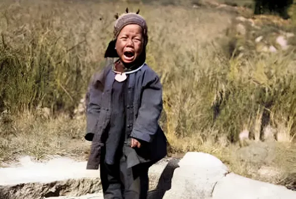 图里的小孩被相机吓到了,嘴张得老大,脖子上套着一只银项圈,老话叫锁命圈,求个平安,这圈子表面打磨得发亮,边上压着细花纹,扁扁的扣藏在后头,不硌肉也不松动,奶奶当年给我弟也戴过一个,她说小娃儿骨气轻,戴个圈压压惊,出门不招邪气,拍照这玩意儿在那会儿稀罕,黑盒子一支起来,孩子就怵,哭声在土坡上回两道,旁边大人也不急,常常拍拍背说一句不怕不怕,等泪花落下,圈子还在脖颈处幽幽地闪。