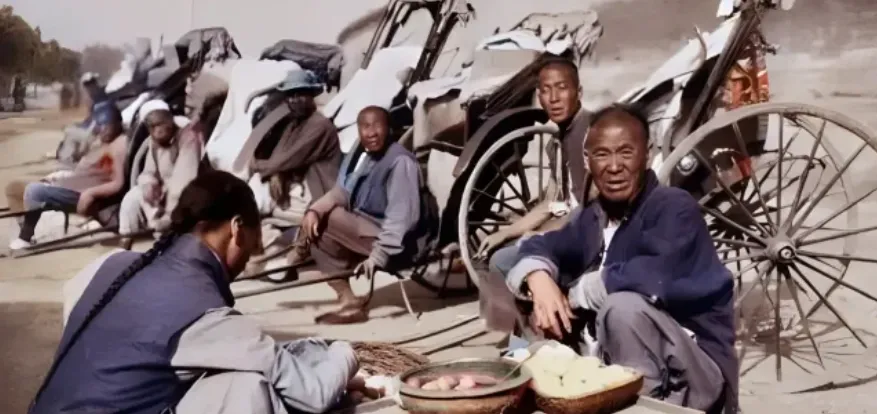这一群人力车夫拢在路边歇脚,小摊主在地上摆着锅碗,切开的白薯黄心冒甜气,几辆车子斜着靠,车辕压在石沿上不晃,车轮条杠细长,辐条一圈圈排得齐整,车夫们袖口卷到胳膊肘,腿上绑着护膝,鞋底厚而硬,长活干出来的样子都在脸上,买卖不忙的时候围着摊吃两口,嘴上嚼着,眼神还不离路口,随时有人招手就能起身,妈妈说以前城里上班的太太们一早要赶铺子,手一摆“到东交民巷”,车夫应一声,铃一叮,车辙就从石板缝里压过去,现在街上车多路快,抬脚招呼一声的功夫被打车软件接了手,人情味儿倒是淡了点。