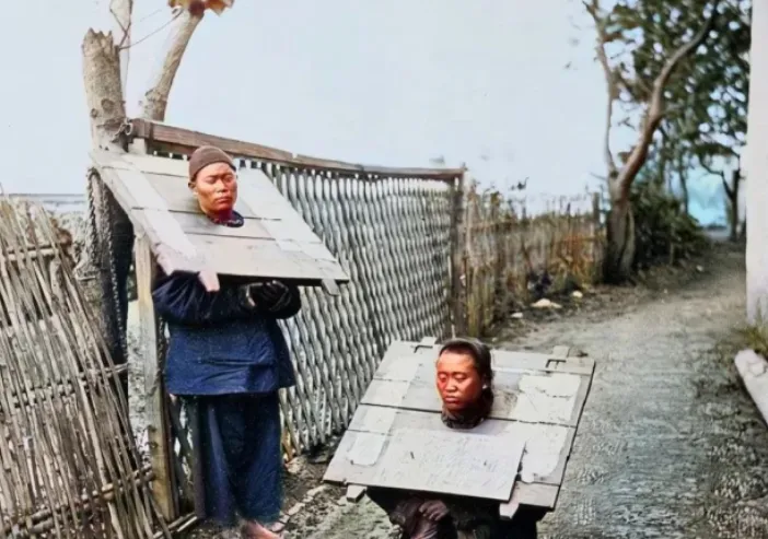 狭窄的乡间小路上,两名戴着重枷的男子被铁链牢牢拴住,木枷宽厚,边角粗糙,钉帽一颗颗鼓出来,冬风打在脸上,皮肤冻得发红,脚下泥水溜滑,他们肩头压得直不起,脖颈往前探,像想喘口气又被板子死死按住,路边篱笆斜斜地立着,树影晃一下又停,走一步枷板就摩着锁骨,吱呀一声像磨牙,老一辈人说这玩意儿比绳索更难受,既羞且疼,人看得见你艰难,自己也听得见自己的喘气,以前治人靠这等家伙,现在讲制度讲法律,铁链木枷少见了,留在照片里头的,是一段冷硬的规矩和一股让人心里发紧的寒意。