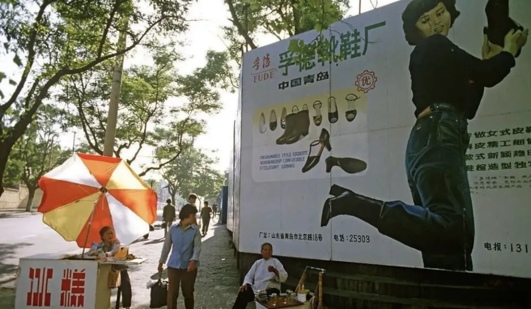 有人卖冰糕,有人卖茶水,边上的大广告牌,是一个时尚女模特,这身装扮放现在也是很时髦的。