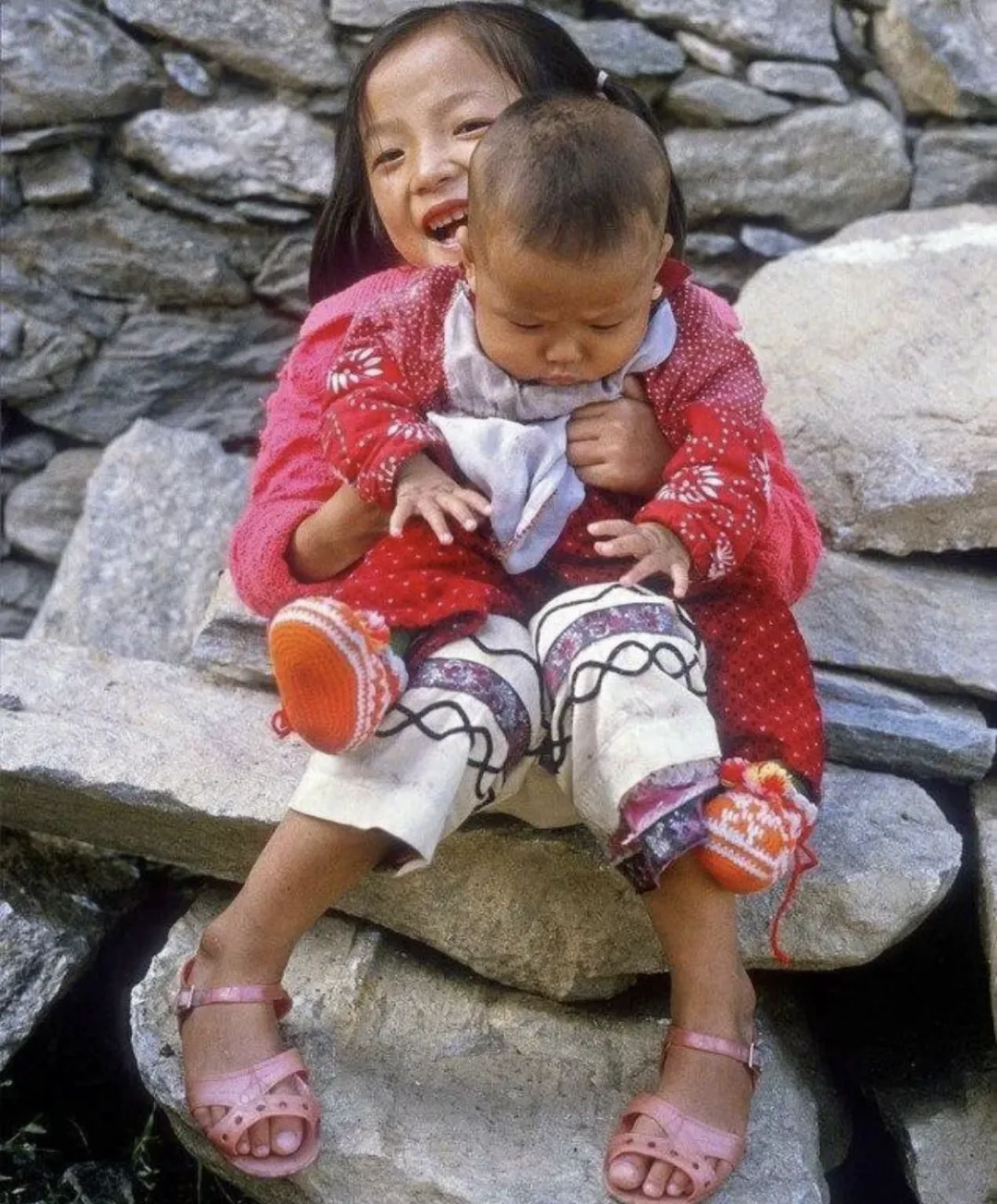 姐姐笑得很开心,她脚上的凉鞋是那个时代热门的款式,他们这一身基本都是家人一针一线做出来的。现在的年轻母亲,应该没多少人会做衣服裤子了吧!