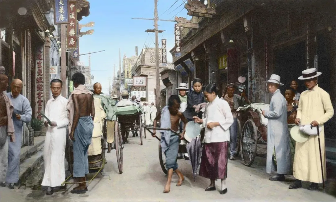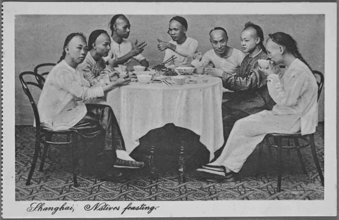 穿着传统服装留着辫子的中国男人在聚餐,这是1920年中国上海一张明信片上的画面