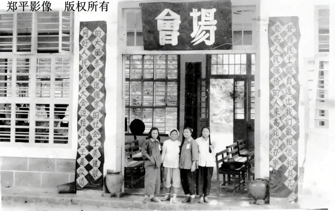 1955年9月26日,广西百色隆林各族自治县召开的人民代表大会会场。几位工作人员在会场门口合影。图左对联的字是“开好人民代表大会迎接社会主义改造的大风暴推进国家的社会主义建设”,图右对联的字是“发扬民主认真选出我们最相信和真正能为人民服务的人来为我们办事”。
