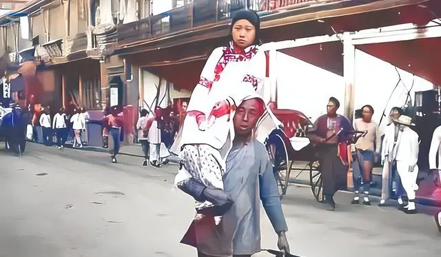 这个小脚叫裹足,绸布一层层勒过去,脚面别着白绫,鞋尖翘起像一截葫芦颈儿,坐在石头上那位把脚往回缩一下,脸上不叫苦,可袖口的褶子攥得死紧,外婆说裹得紧才像样,可走起路来心口往上提,现在鞋柜里摆的全是运动鞋,脚丫子舒坦,想想也算把苦从脚心里退了出来。