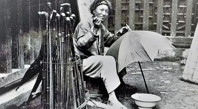 这个拿一把骨架的人叫修伞匠,脚边木杆子一排排立着,锥子在手上转半圈,再往伞槽里一栽,布面扯直,抹点浆水,太阳一照就干,小时候巷口下雨天我妈让我去找他,说人家收拾一回能顶半把新伞的钱,别嫌慢,等着就等着,回来的路上雨也小了。