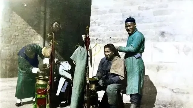 这几位围着铜盆的叫剃头匠,挑子一搁墙根儿,热水一冲刀背亮一下,嘴里抹两句行话,客人脖子一伸,耳边刮得发痒,边上人笑着插一嘴,头发落在围布上像一层黑糠,黄昏风一吹就散了,那会儿家门口就能理发,现在推拉门里机器声轰得紧,可人话少了。
