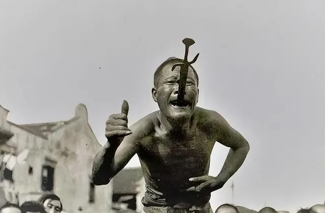 这位张嘴的玩意儿叫江湖把戏,钉子在唇边晃,围了一圈人屏着气,手一比划说不疼,孩子仰着脖子瞧,娘亲把人往回扯一下,钱兜里摸出两枚铜子丢进碗里,一场热闹散得快,汗味儿和土腥味儿留在原地。