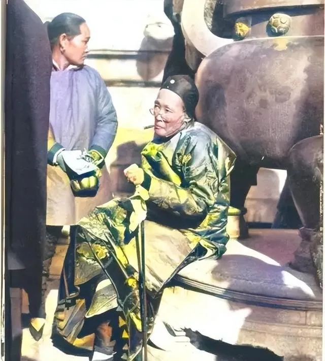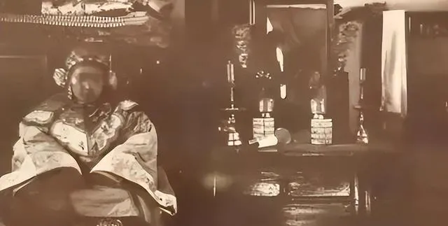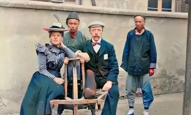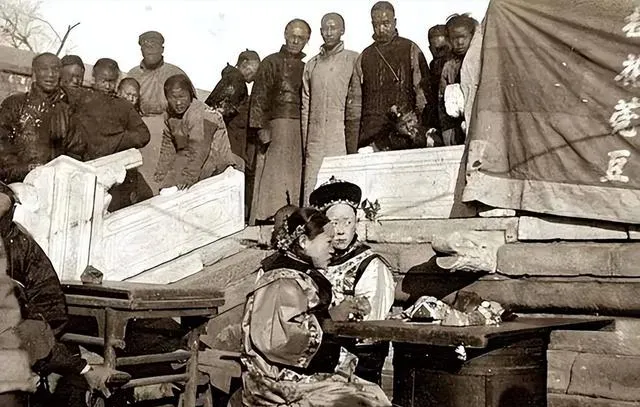 图中坐着的这位叫地主婆,绸衣上的花团从肩头垂到膝上,手里攥着烟杆,旁边有个使唤的人站着,围看的人目光黏着衣角不挪,这种场面以前不少见,现在街上人人一身便衣,谁也不想被盯着看,眼神松快多了。