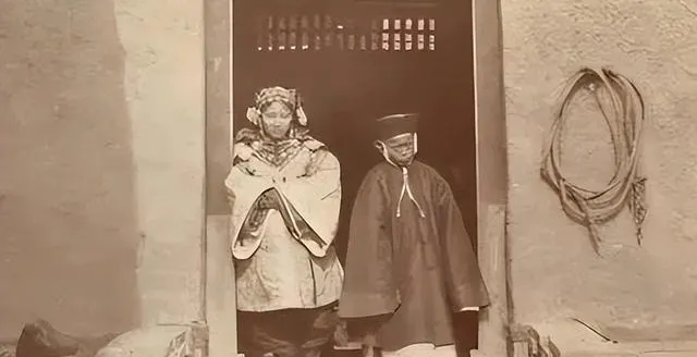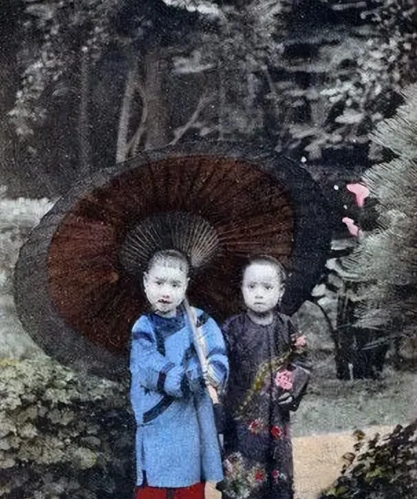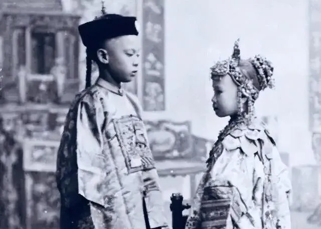 图里这对小两口叫童婚夫妻,绸缎衣料压着纹路发着闷光,头上的珠串沉得人抬不起眼皮,男孩的袖子宽大,站姿拘着,女孩脸是板着的,像被大人推到门槛上说一声拜堂就算数,奶奶当年叹一句,那时候结婚讲的是家里能不能扛日子,不是孩子懂不懂亲事,这话说得直,现在想想心口还发紧。