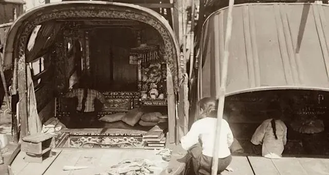 老照片:童婚夫妻10多岁,富人带7个小妾出门,船妓整理床铺等客。
