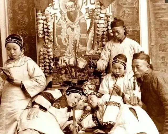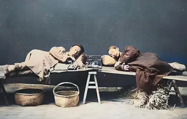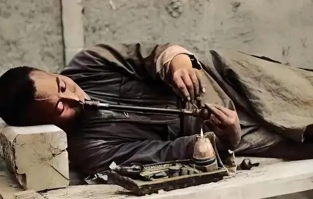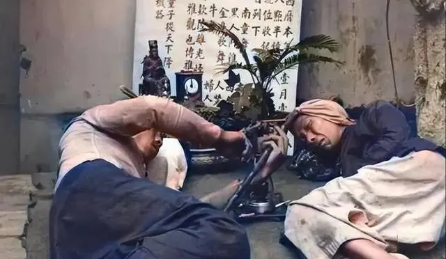案几上排着长烟枪,背后贴神像,几个人斜躺着轮流吸,屋里静得很,只有火苗子噼啪两声,门外有人路过,脚步不肯停,这类地方人怕沾惹,照片把那股冷气照得明明白白。