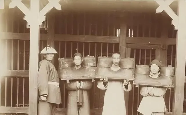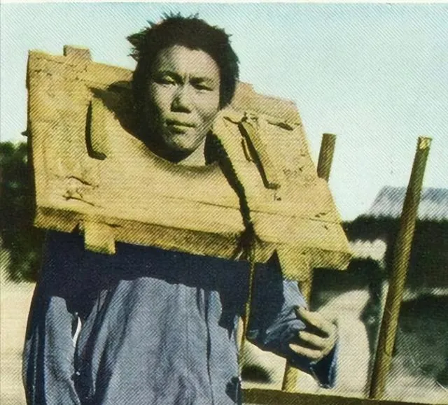 这个木框叫枷,套在脖子上,木面被汗水磨得发黑,钉子冒出一点锈光,独行的那位眼里有股倔,另一张四人并排站着,肩头压得低,这些画面在戏里也常见,可真照出来没半点好看,人要是走到这步,脚底下的路就只剩一条窄的了。