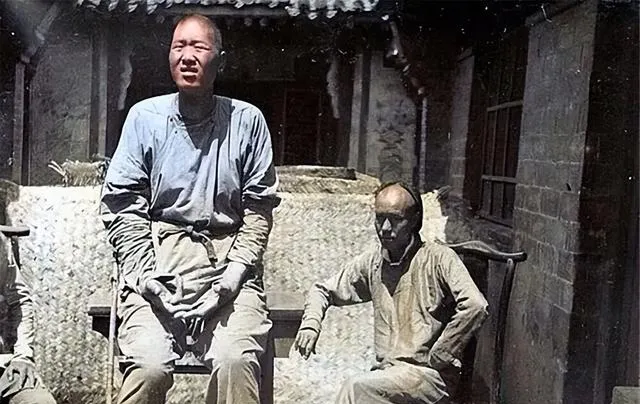 这个高个儿坐在板凳上,背后是编好的草褥,脸被太阳贴得通红,旁边人缩在阴里,表情各不相同,像一张牌摊开了给你看,不解释,也不辩解,旧日子的冷暖就这么直愣愣杵在那儿。