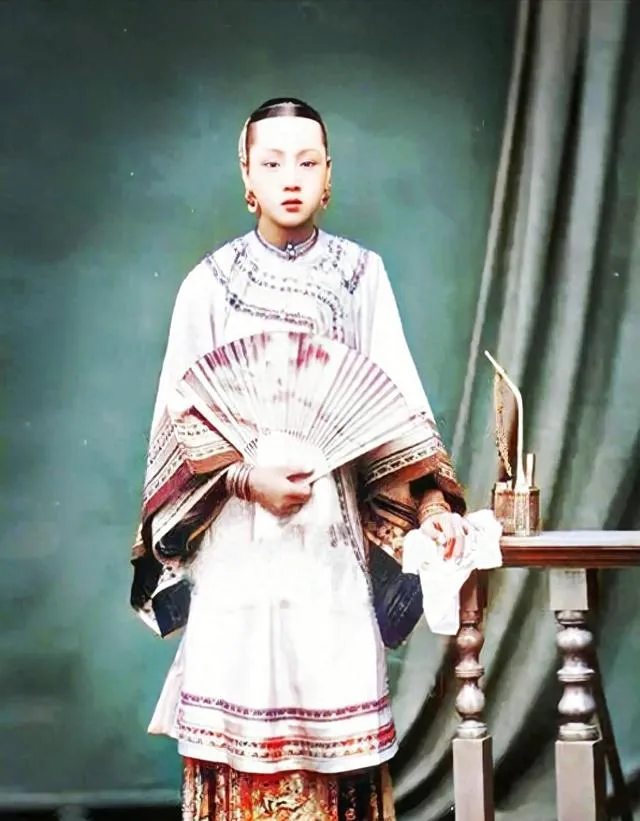 你看这张,穿得“贵气得很”的叫满清格格,衣服宽宽大大,袖口下坠,里头绣着花,外袍像罩衣,手上拿着团扇,金耳坠挂耳边,发式乖规整整,不用多说是谁家小姐也知道是主人娘家有点来头的大院,照片里那股气场,一副不慌不忙站定的位置,现在的小姑娘化妆打扮折腾半天未必顶得上人家这份讲究。