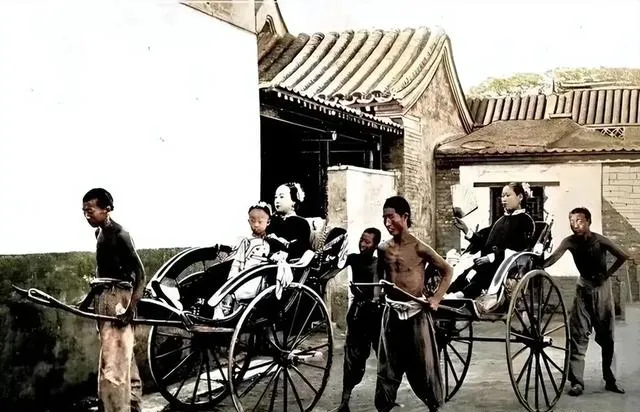这里是黄包车队,女人坐车男孩拉着走,拉车的胳膊全都是筋,裤脚卷着,太阳下汗透了衣裳,这活比现在当出租、外卖还来得累,人家拖家带口靠两条腿咬牙赚硬钱,小时候村里谁家来亲戚,父亲偶尔说“走路比什么都真”,别看现在满街小车,那些拉黄包的日子一去不复返。
