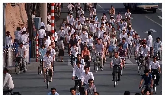 那条马路要是搁现在,汽车摩托把路攒得堵死,以前清一色自行车,钳把手上一挂布袋,带孩子的,装菜的,连穿背心的男人都能手里再提一兜菜,叮铃铃的铃声混着人喊,大家都是一路风生水起。