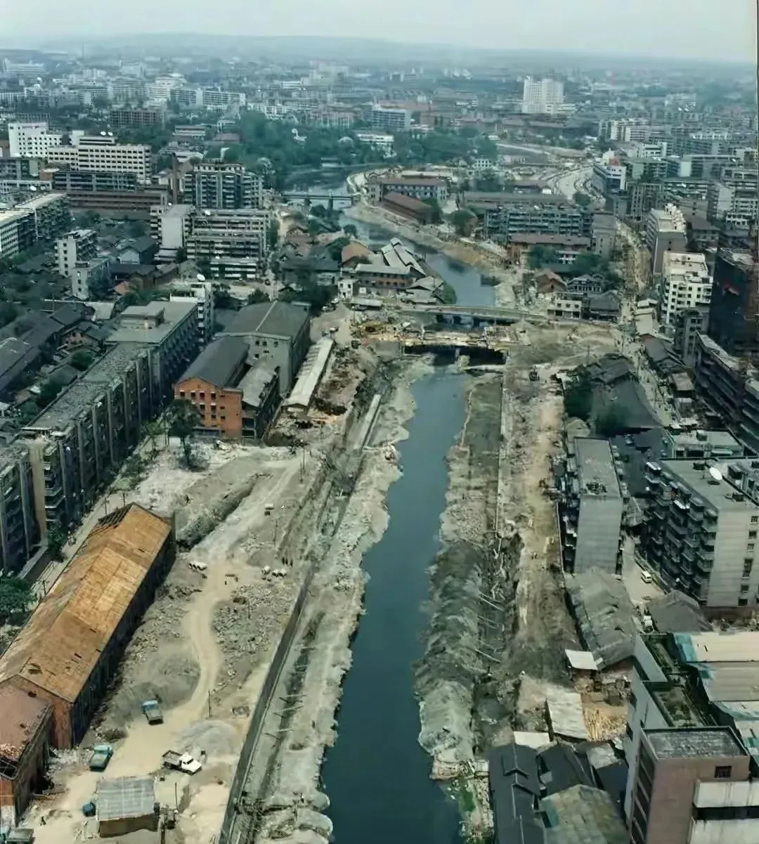 大哥大姐们,这张航拍照片记录的是成都城市改造的场景,河道两岸正在施工,老房子被拆除,新楼房正在建设,那个年代的成都正经历着翻天覆地的变化,虽然看着有些杂乱,可每个老成都人都知道,这是城市发展必经的阶段,河道两边的老房子承载着无数人的记忆,拆掉它们心里说不出的滋味,可新城市的建设又让人充满期待,这种矛盾的心情,只有经历过那个年代的人才能体会。