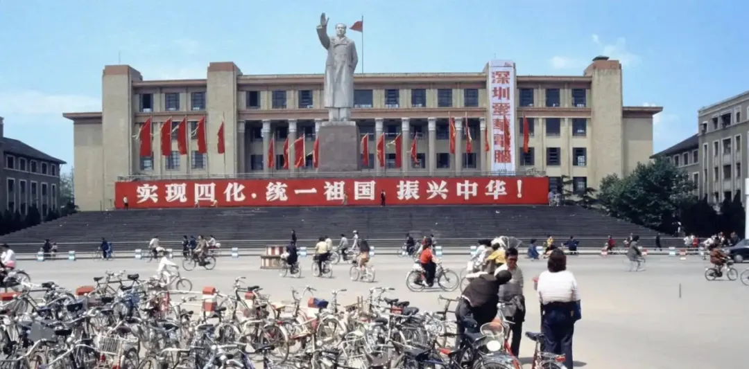 大哥大姐们,这张照片拍的是当年成都最热闹的广场,广场中央矗立着毛主席的雕像,红旗飘扬,标语醒目,楼前的台阶上站满了人,那个年代这里是成都人最爱去的地方,不管是集会还是庆祝活动,这里总是人山人海,广场周围停满了自行车,那时候自行车可是主要的交通工具,现在这个广场早就变了模样,可老成都人一提起这里,脑海里浮现的还是这张照片里的场景。