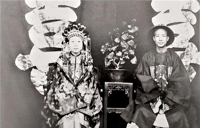 图中一男一女,小小年纪就被打扮得雍容华丽,这就是清末“早婚”影像,袍子宽大花纹密,头饰里包着金光,正襟危坐,一左一右互相看着,神情还有点拘束,小时候听奶奶说,那时候官宦人家讲究门当户对,娃儿一掀盖头就算定了终身,男上加辫子女头插凤钗,都是后院日常,现在小孩玩过家家,也没见谁穿这么沉的东西。