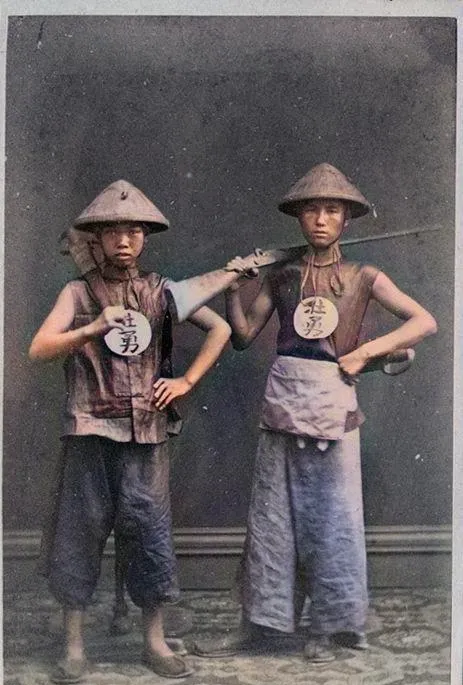 还有一组清末军队的照片,每次细看,都会觉得讽刺。印象里军队应该虎虎生威,可照片里的兵,一个个站得软塌塌,没精打采,脸上没有狠劲儿,甚至有点为难地看着镜头,“壮勇”两个字绣在身上,但士气和精气神早被年月磨光了。他们穿的不是军服,而是像民兵杂牌军,里面混着汉军、八旗兵,发型那条长辫子,成了三百年落后的真实符号,剪掉那辫子,气质立刻不一样。