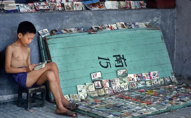 图里那块掉漆门板,摆着一地小人书,摊主自己也顾不上卖,光顾着津津有味读书,小人书一毛二毛,贴得满满当当,坐地摊追连载,一页能翻半天,看完还能和隔壁小伙伴互换,“你帮我留着那本孙悟空下集”,书页边都是翻烂了的印,没什么收藏概念,就是谁攒得多谁能成小明星,边看边聊,没人嫌地上脏,只怕天黑收摊早,现在的小孩手机上一堆动画片,可咱就爱一本本握在手里的实在劲儿。