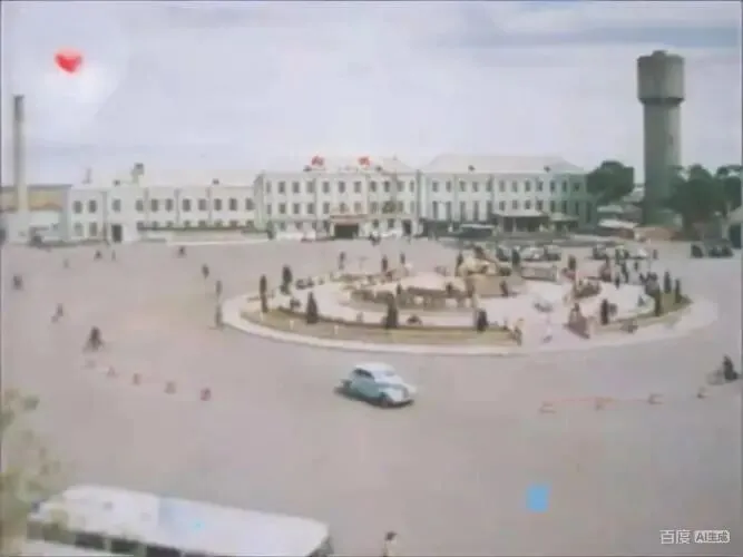 广场中央的圆形花坛与喷泉,是市民休闲、接站、送别的首选地点。广场上行人三三两两,有赶火车的旅客,也有闲逛的市民,一派悠闲热闹的景象。一辆浅蓝色的老式轿车行驶在广场上,在当年绝对是“稀罕物”;远处高耸的水塔,是那个年代北方城市的标志性建筑;左侧的烟囱,则见证了白城工业发展的历史。