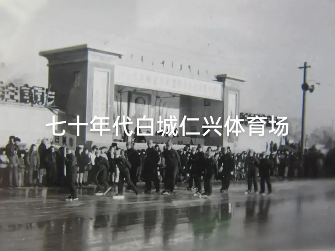 画面中庄重的体育场门楼,是1948年为纪念四平战役中牺牲的“辽吉功臣”马仁兴将军而建,名字里藏着白城人的缅怀与敬意。门楼上方的横幅与标语,透着七十年代鲜明的时代气息,这里曾是全城大型集会、运动会与誓师大会的核心场地。