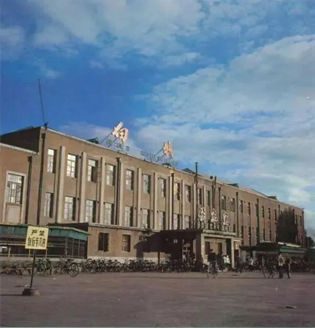画面中这栋棕褐色的长条形建筑,就是当年的白城站站房。它始建于 1925 年,最初名为 “白城子站”,1955 年正式更名为 “白城站”。建筑风格朴素厚重,带着鲜明的工业时代气息,像一座大型厂房,是当时东北地区实用主义建筑的典型代表。 广场上密密麻麻的自行车,是那个年代最具代表性的 “出行大军”。左侧 “严禁自行车入内” 的警示牌,也成了时代的注脚。行人或扛着行李,或推着自行车,脸上带着奔赴远方的期待,或是回到家乡的踏实。