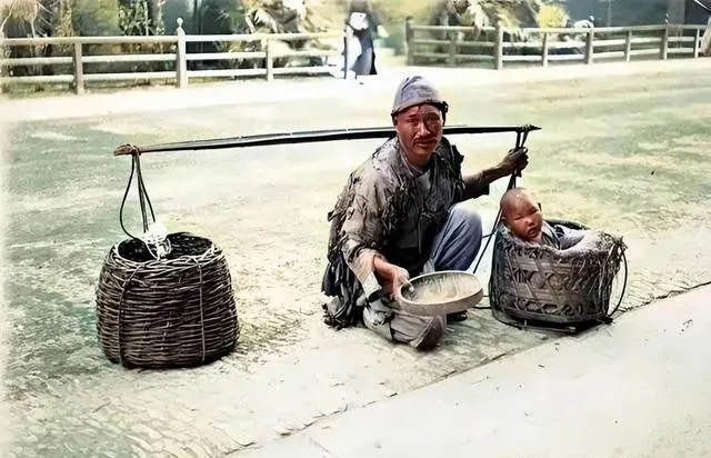 图里父子俩,篮子里坐着小孩儿,旁边一只饭碗静静放着,这样的情景真是扎心,父亲穿一身破麻布,手里攥着空碗,地上画的圈圈,风一吹,脸上的泥就像年轮一层层,小时候奶奶教的口头禅就是“穷日子能熬过去就是盼”,这照片看着不舒服,可就是那一代人的真实,没谁把讨饭当个技艺,都是到了万不得已,才扛着孩子街头熬。