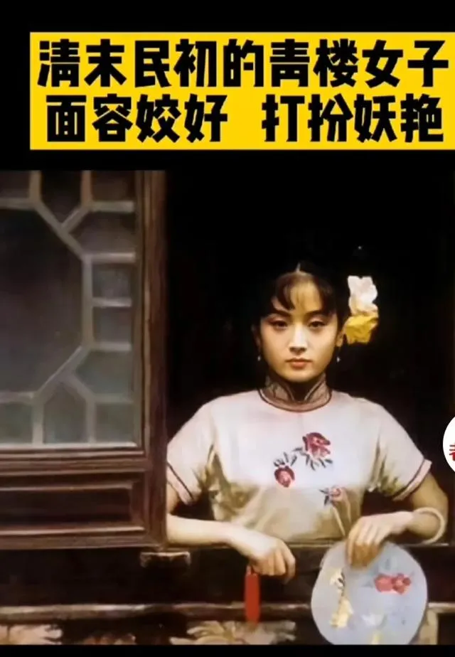 画面左边窗台,姑娘倚着一只胳膊,手里团扇遮半张脸,打扮得一身粉艳,那种娇媚劲跟现在舞台上的还真不一样,听外婆讲,青楼女子是被逼无奈,哪里敢张扬自己,嘴上粉粉嫩嫩,心里却冷如冰,明白人一看就知道那不是新鲜日子。