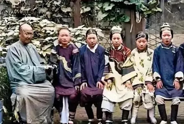 画里男人端坐,身旁左右一排媳妇,裙袄分明,头饰累累,坐得规规矩矩,那阵子能养得起一屋妻妾的都是有钱有势,姑娘们表情都板着,也看不出有多幸福,外人光看热闹,自己苦不苦全藏在脸下头。