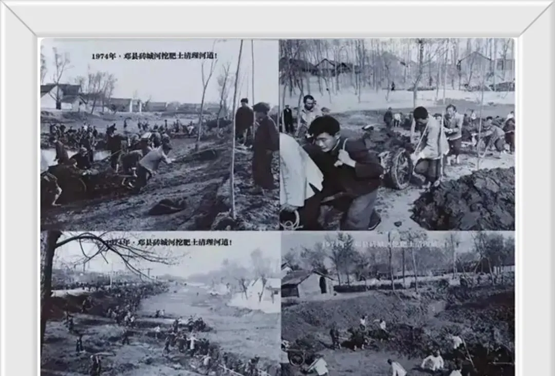 图里这一片人挤在河道边,拿铁锹抡着、肩上扛着扁担,是旧邓县清理砖城河时的场面,泥水到膝,旁边推着小板车的年轻人嘴里还喘着热气,老辈人说那个时候讲究一个齐心合力,号子一喊,浑身的劲就上来了,放到现在掏手机拍两张就散了,当年可不,谁都怕自己落了队,回头还得在大喇叭前点名呢。