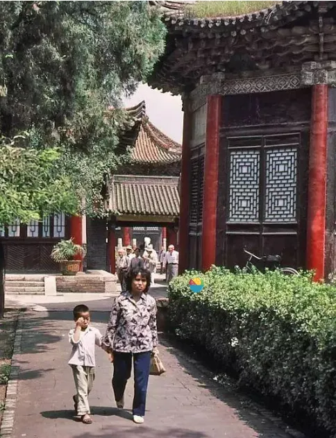 西安化觉巷清真大寺,一位穿着花衬衫、深色长裤的女性牵着小男孩行走,孩童身着浅色短袖与卡其色裤子,二人的衣着是 80 年代城市市民的典型日常装扮。