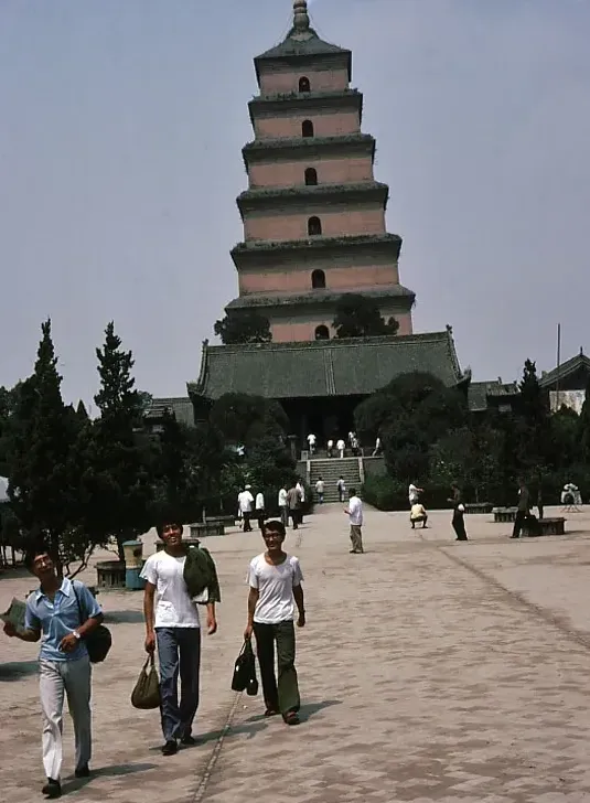 西安大慈恩寺大雁塔前广场,三位穿着短袖、提着布包的年轻男性正从广场走过,广场上还有零星游客,整体氛围朴素而宁静,当时的大雁塔景区没有现在的音乐喷泉和商业街区,游客数量不多,景区设施相对简陋,像是一处安静的历史文化场所。