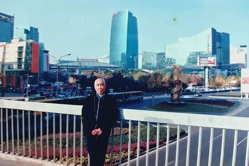 (下图是父亲在海淀黄庄过街天桥上的留影,背后是中关村金融中心和中钢国际大厦)