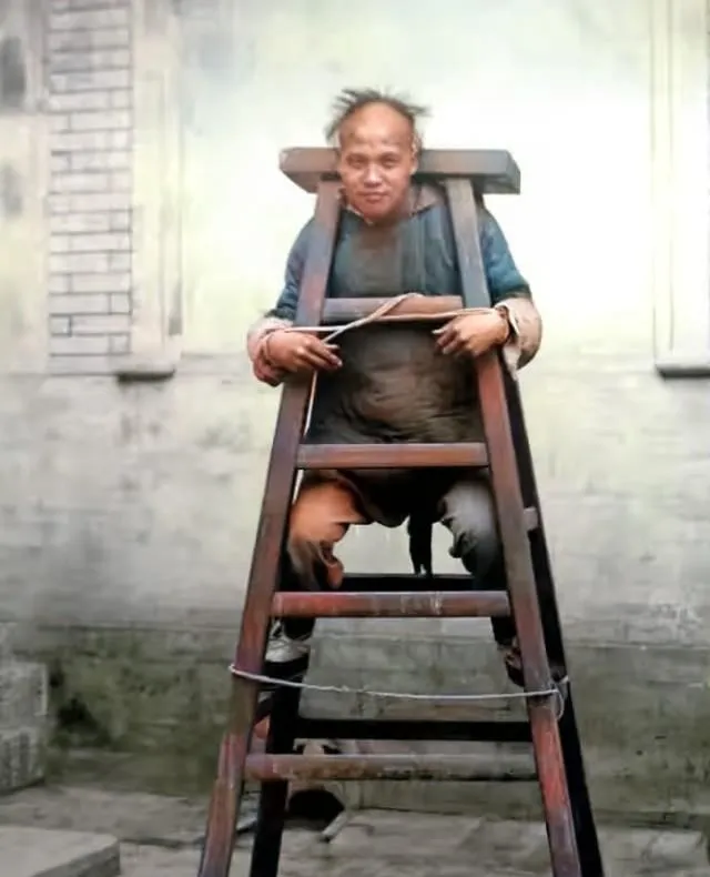 这器械叫三脚刑架,犯人脖子被卡在横栏上,两肩压着木枷,腿还伸不直,光看这姿势就知道浑身别扭,照片里他竟然乐呵呵地冲镜头笑,旁边的看门老头咂舌头,说这人胆除非搁今天,不然没人敢摆这表情,小时候老街口拐角还能见二道贩子戴枷游街,小孩都得躲得远远的。