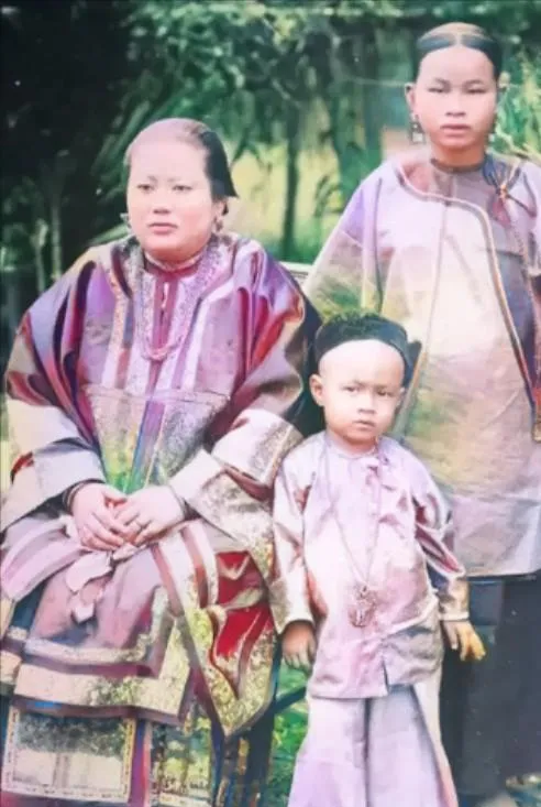 照片里的这位说是胖夫人,坐太师椅上,一身银红色大衣,花边宽袖,旁边一男一女,男孩顶个大光头,还带着圆帽,两位女士没缠足,清末妇人讲究个气派,但衣服往往厚大松垮,说实话看久了真没啥线条美,娘常说电视剧里清代女人穿得洋气,那都是后人自己添的,以前谁舍得料子和剪裁。