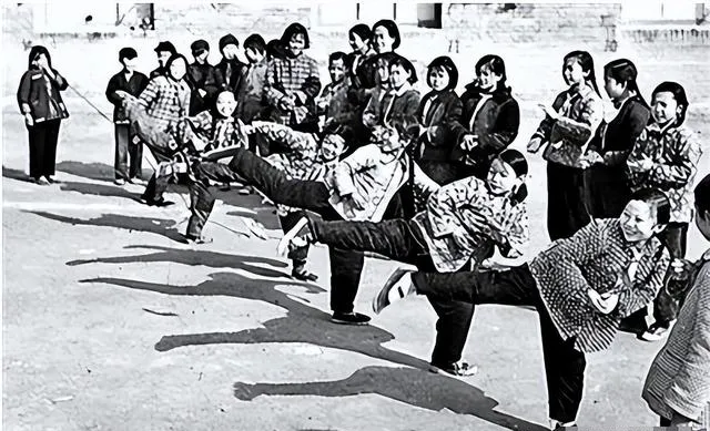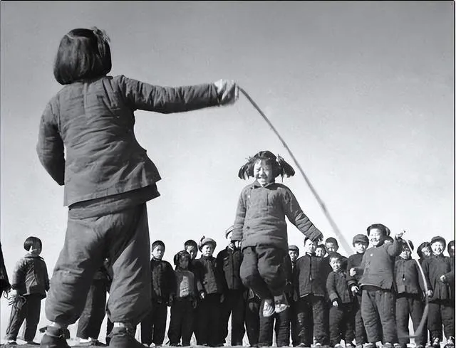 图里套着厚棉袄扎着小辫的孩子们在操场跳大绳,两头各站一人,胳膊一甩绳子带着呼呼声,跳的那个笑着飞起来,身后一整圈同龄孩子围得密密麻麻,轮流喊着口号——“大娃进、小娃退,你跳一个我来陪”,冬天手冷的时候,跳两圈再缩手塞进袖筒,妈妈在边上喊**“小心别摔了!”**,其实根本没人想停。